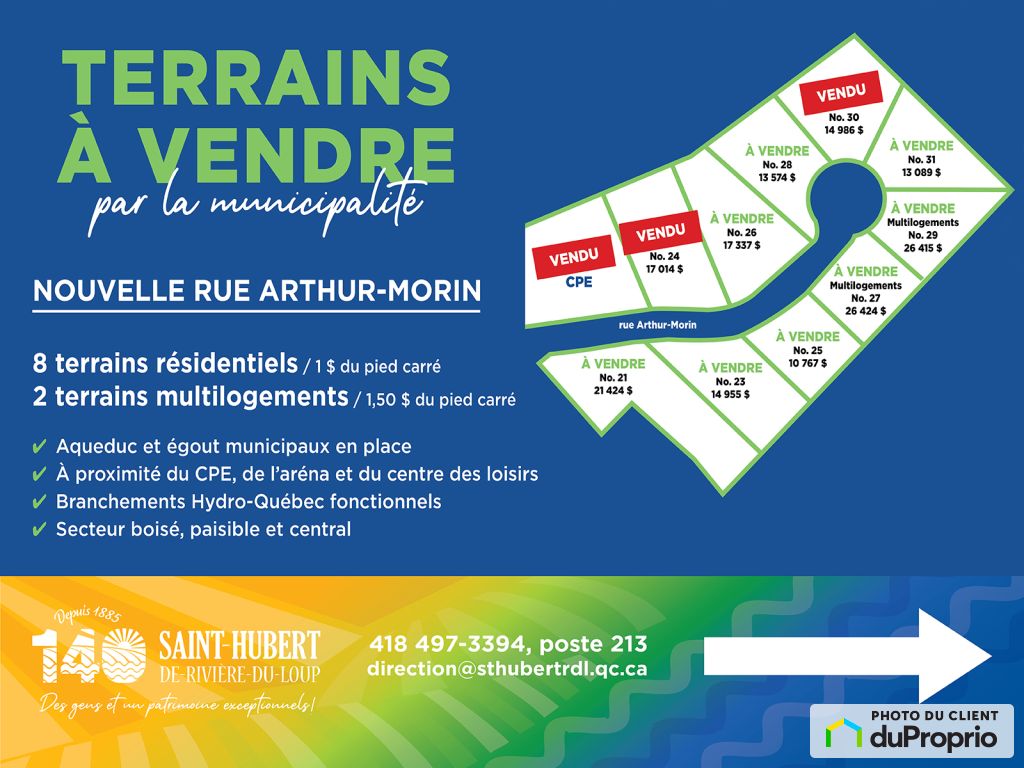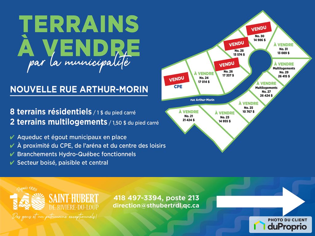 La municipalité vous propose de superbes terrains arpentés, prêts à construire, à partir de 10 767 $ + taxes !