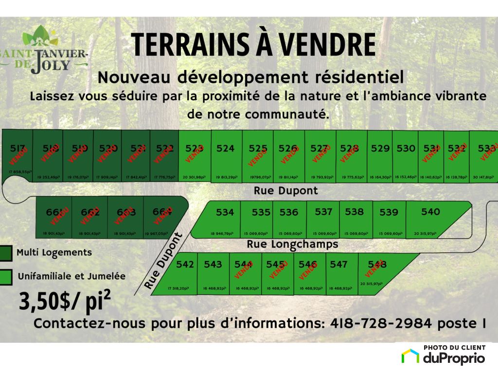 Les terrains résidentiels sont offerts à seulement 3,50$ le pied carré, un des meilleurs prix de la région! Cette tarification abordable rend l'acquisition d'un terrain à Saint-Janvier-de-Joly particulièrement accessible, que vous souhaitiez y établir votre maison de rêve, investir ou accueillir votre famille à long terme. Avec ce coût, vous bénéficiez d'un milieu de vie incomparable dans un environnement paisible, tout en réalisant un investissement judicieux. Il s'agit d'une occasion unique de devenir propriétaire dans une municipalité dynamique, accueillante et tournée vers l'avenir.