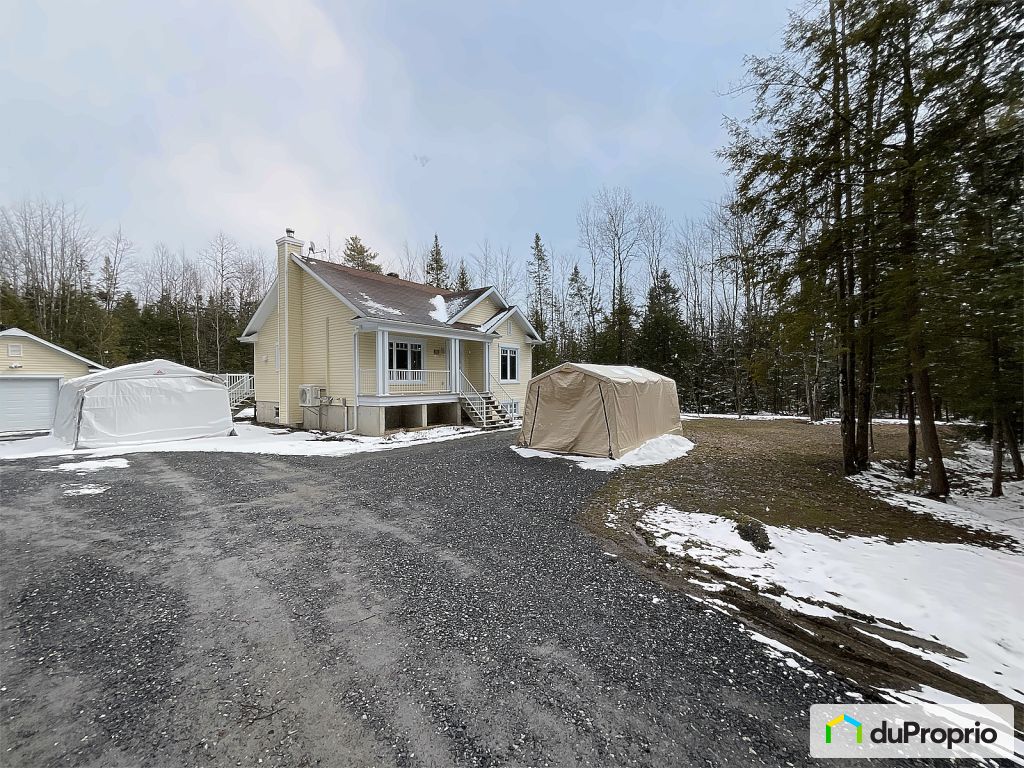 The house, maintained with great care, is practically turnkey (only the staircase is to be finished with the coating of your choice); it offers 3 good-sized bedrooms, a large family room with a wood stove that warms you up on cold winter evenings and a bright living room offering a magnificent view of nature throughout each season. Equipped with a very large patio protected by a retractable awning, allowing occupants to recharge their batteries or enjoy themselves in good company, a recent shed, a shelter for firewood and a garage to park a vehicle and store your goods, all in the middle of mature trees, you will feel at once out of place and so at home! No neighbours in the back or on the left side, the land is entirely out of sight, which gives it an undeniable advantage