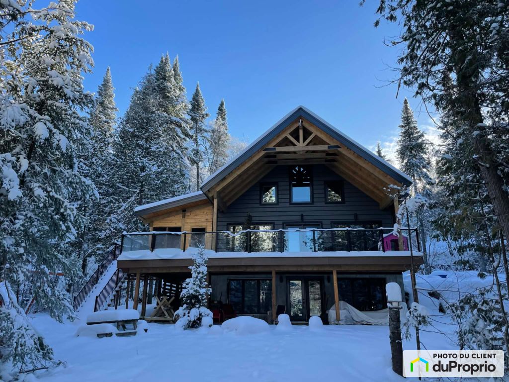 behind you.Magnificent house of 2 floors and three quarters, 30 x 32 feet, 4 bedrooms and 3 full bathrooms built in 2023 with Boréal products, using a solid piece-by-piece technique. Take a seat on the impressive 400 square foot terrace, built with composite flooring, tempered glass railings and protected by a cathedral ceiling that inspires luxury and relaxation. Or take refuge in the gazebo in June to enjoy the outdoors away from mosquitoes. Enjoy breathtaking views of the lake from virtually anywhere in the house. All floors are red pine, except for the basement floor, which is made of concrete with radiant glycol heating, as well as those in the entrance hall and ceramic bathrooms, installed on top with an electric heating system for your comfort.