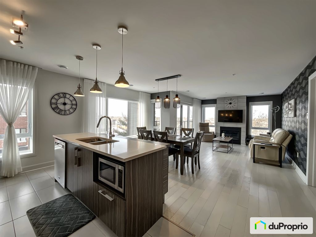 Généreuse fenestration, cuisine moderne, chaleureux salon avec foyer au gaz naturel et beau plancher texturé sur membrane acoustique.