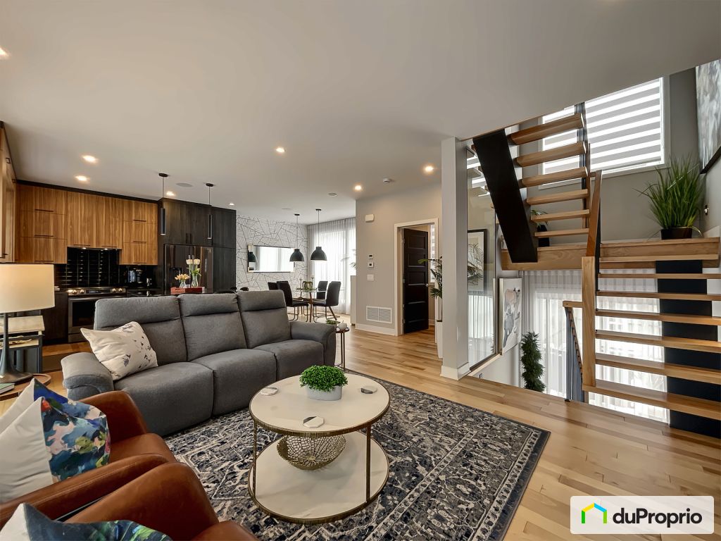 Les plafonds de 9 pieds offrent une belle harmonie entre le salon, la salle à manger et la cuisine. Une cuisine d'un fini soigné, d'un grand îlot central équipé de comptoirs en quartz. Un foyer électrique ayant l'aspect d'être en suspension intégré au mur soufflé du salon.