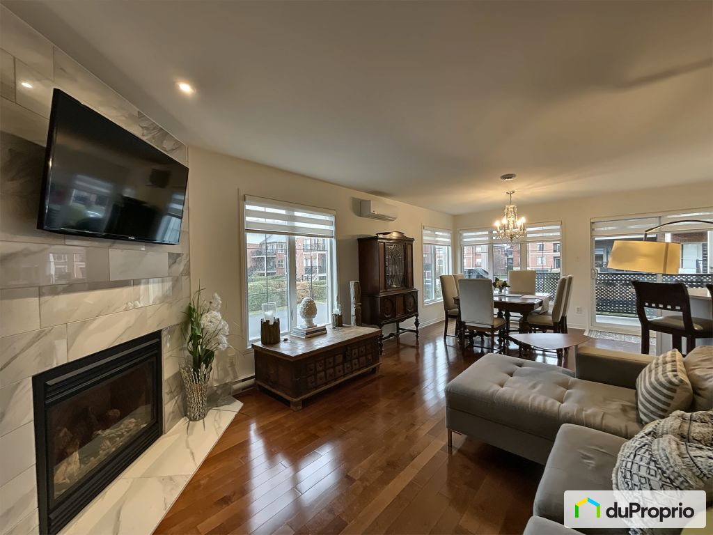 Condo with beautiful natural lighting on 2 floors in a peaceful setting. Hardwood floors, elegant kitchen freshly renovated with a quartz countertop, 2 large bedrooms, 1 bathroom and 1 powder room. Large balcony overlooking a private backyard. Air conditioning. Fireplace and natural gas hot water tank, inground salt pool. Storage space (loach) 6' 5" x 3 4".