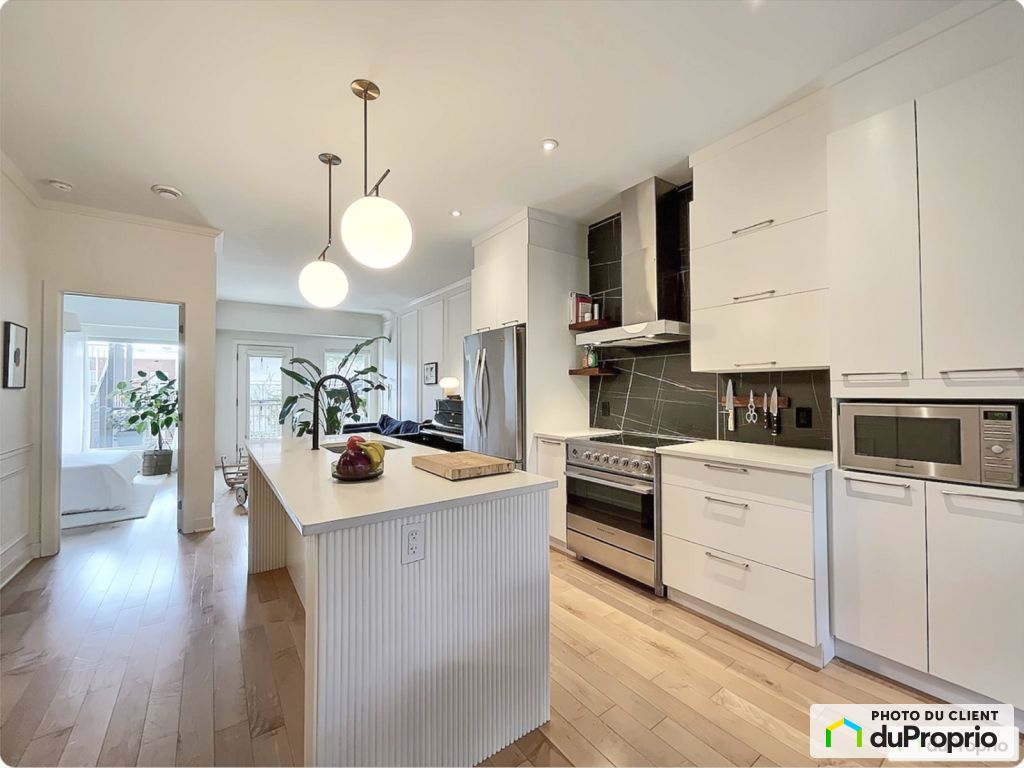 Superb condo in Mile-Ex. Bright and stylish two-bedroom condo in the heart of the vibrant Mile-Ex district. Large windows and light wood floors flood the space with natural light. At its center, a modern kitchen with a central island opens onto the dining area, creating a warm and inviting atmosphere. The unit also includes ample storage and a spacious vestibule.
