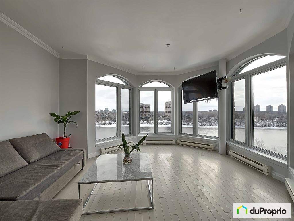 Panoramic views of the St. Lawrence River from this bright corner condo.