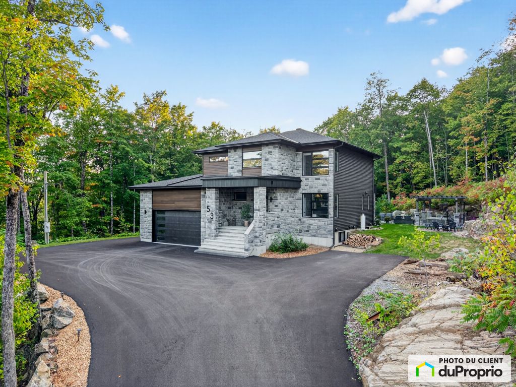 Spacious kitchen, designed for entertaining. Private wooded lot for absolute tranquility. Double and heated garage. Comfort, space and nature combined near the city.