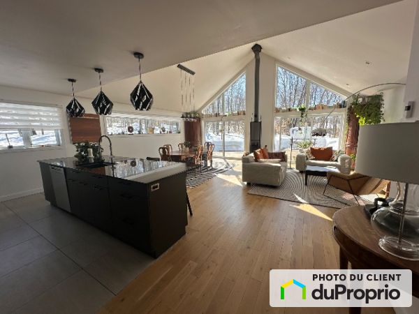 En entrant, un généreux espace de vie ouvert, confortable et pratique pour recevoir (la table du salon accueille 8 personnes), décoré par des plantes, des uvres d'art et des objets choisit avec soin, rendant le tout habité et inspirant. L'îlot central ajoute une touche conviviale; un poêle à bois (marque Stûv) amène une chaleur pour les saisons plus froides; une thermopompe rafraîchit en été.