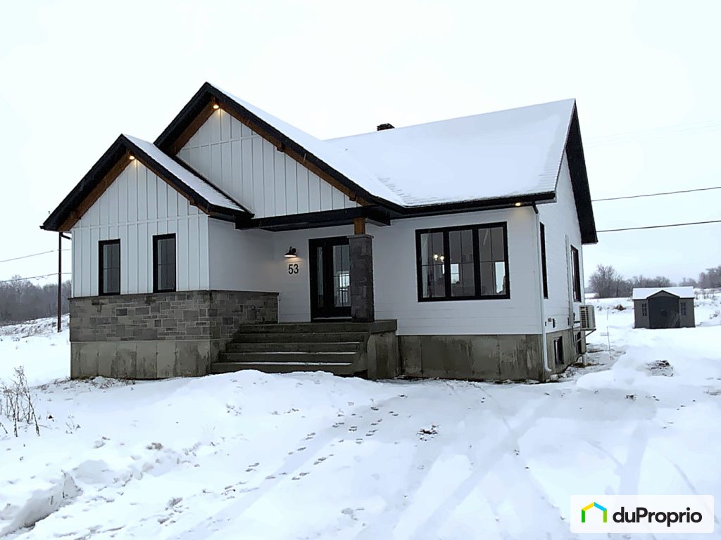 Superbe maison plain pied de style farmhouse! Aménagement à aires ouvertes avec grand îlot central en noyer (8' X4') et plafond cathédrale de 14' avec poutre centrale. Magnifique salle de bain avec plancher chauffant, bain autoportant et douche italienne. Nouveau secteur résidentiel de choix près de plusieurs services, sans voisin arrière et accès au boisé. Sous-sol non aménagé, donc libre à vous d'en faire ce qu'il vous plait (possibilité d'en faire 3 chambres). Patio en composite et dalle de béton fait à l'été 2023. Encore sous garantie maison neuve pour 3 ans. Une visite vous convaincra!