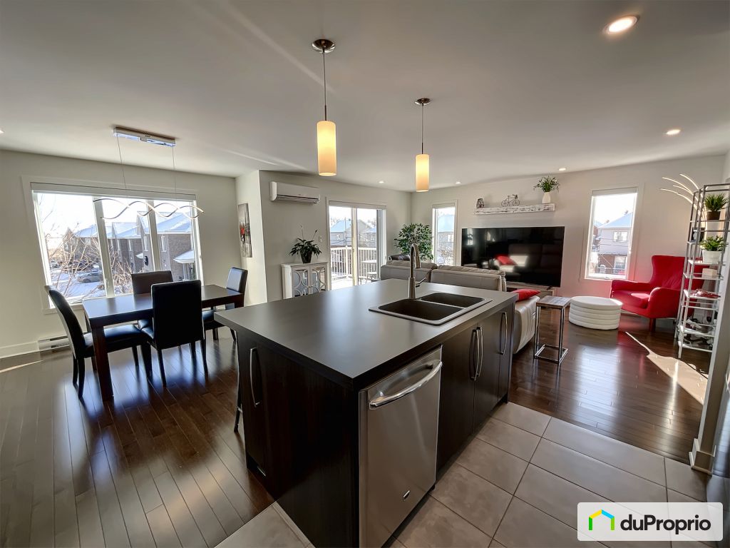La cuisine, au design contemporain, combine beauté et commodité avec son îlot surdimensionné, son dosseret de céramique, sa très grande superficie de comptoir, son garde-manger avec tiroirs coulissants et ses nombreuses armoires de rangement. La salle à manger adjacente offre tout l'espace requis pour recevoir plusieurs invités autour d'une belle table. Finalement, le spacieux salon vient compléter l'aire ouverte de cet accueillant condo.