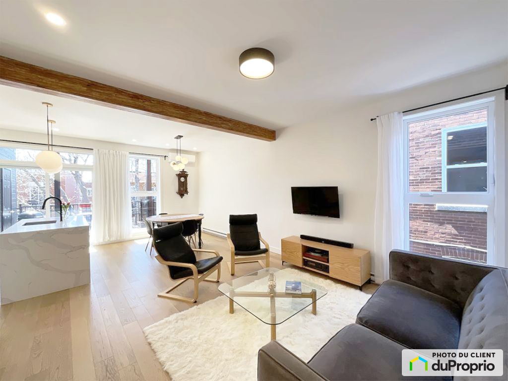 Condo très ensoleillé grâce à sa fenestration sur 3 façades et son puits de lumière. Unité entièrement rénovée avec finis haut de gamme : plafonds de 9', planchers en chêne blanc, comptoirs et îlot de cuisine en quartz, douche vitrée en céramique, bain autoportant, chambre des maîtres avec walk-in. Vaste espace de vie à aire ouverte. Grande terrasse avec porte patio adjacente à la cuisine, idéale pour vos BBQ, en plus d'une 2e terrasse à l'avant.