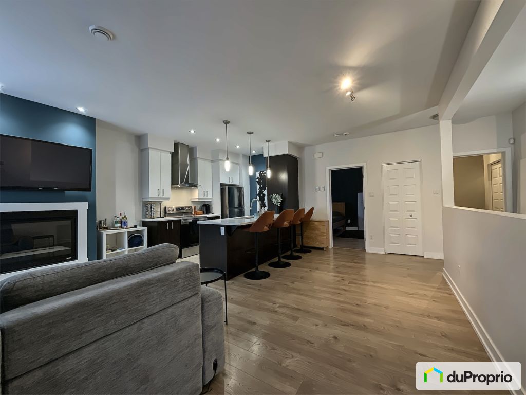 Ce condo d'angle situé au dernier étage offre une atmosphère chaleureuse et accueillante dès votre entrée. Sa disposition ouverte laisse entrer beaucoup de lumière naturelle, soulignée par les hauts plafonds qui donnent à l'espace une sensation de luminosité et d'espace. La cuisine, la salle à manger et le salon se marient parfaitement, avec un îlot idéal pour se retrouver entre amis ou en famille. Un foyer au gaz ajoute de la chaleur et du charme au salon.