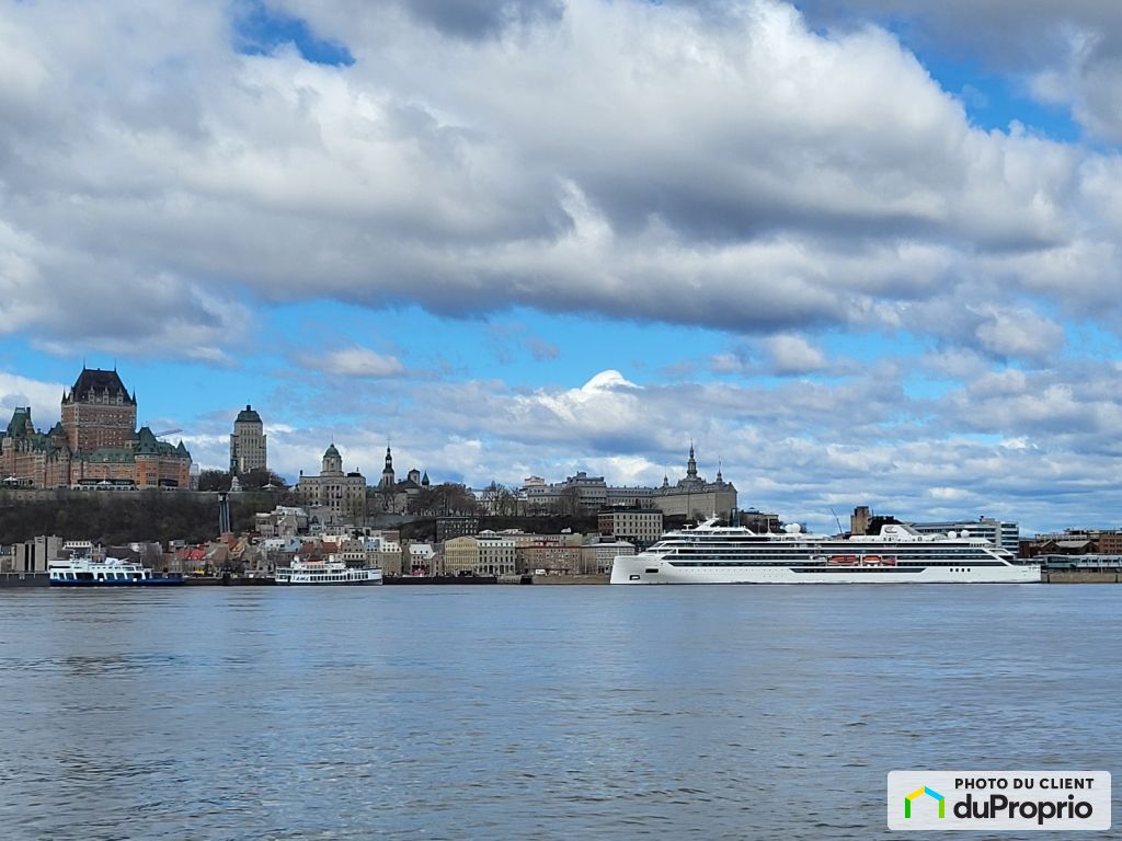 Condo lumineux situé au 5ième et dernier étage sur la rue St-Laurent à Lévis avec une vue panoramique sur le fleuve, le Château Frontenac, les bateaux de croisière et de magnifiques couchers de soleil.